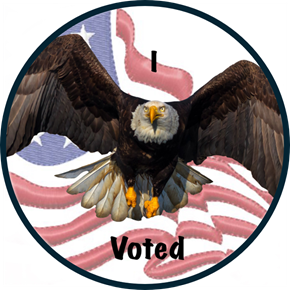 Image description: Sticker design by Ivy Garris includes a bald eagle in flight and the words "I Voted" in front of a backdrop of a wavy American flag.